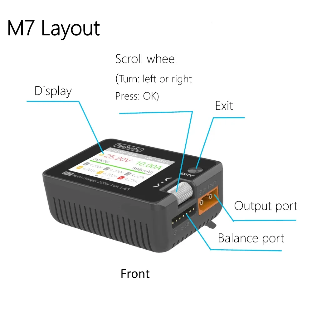 M7 — це багатофункціональний інструмент із серії Tool Chain, який поєднує в собі функції балансного зарядного та розрядного пристрою, електричного дисплея, пристрою вимірювання сигналів і джерела сигнал