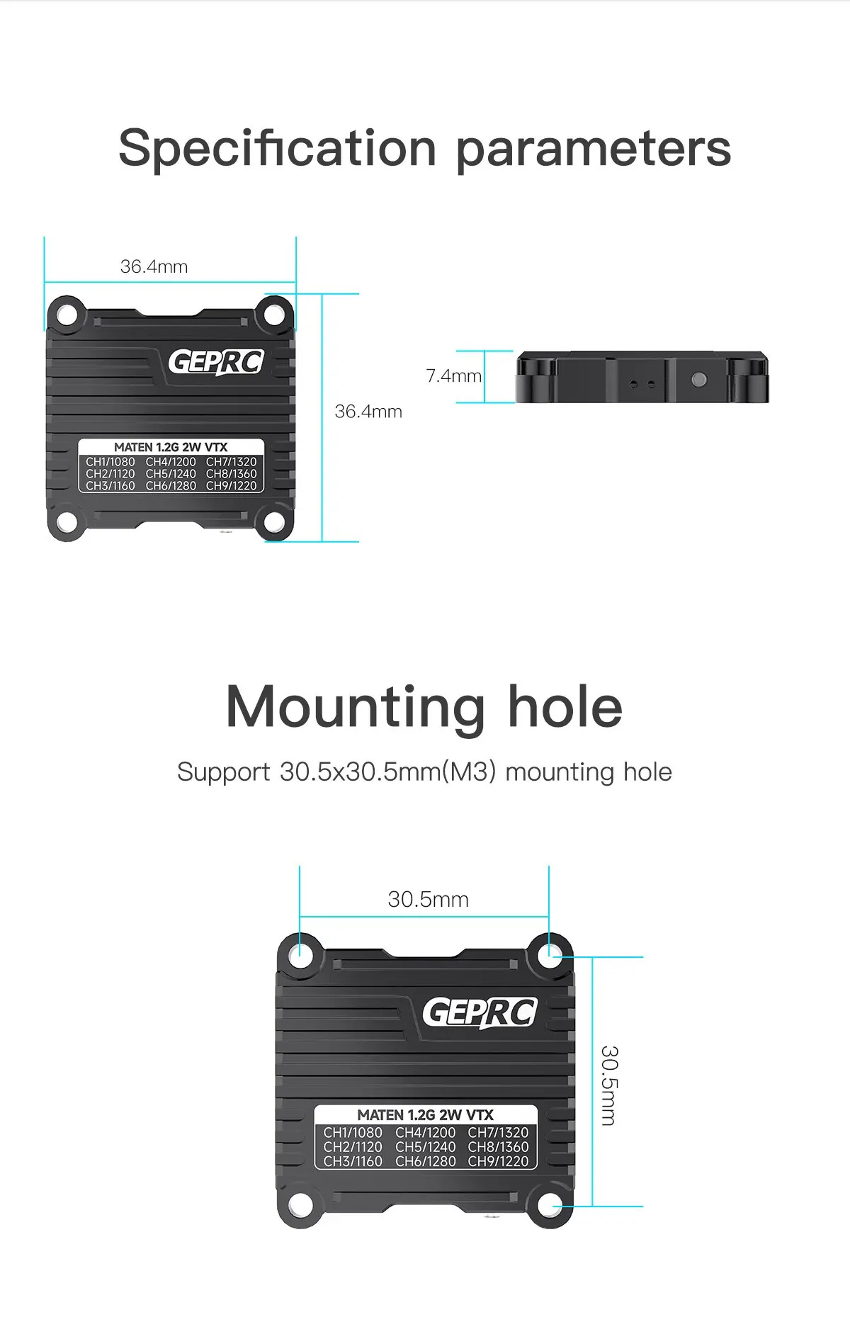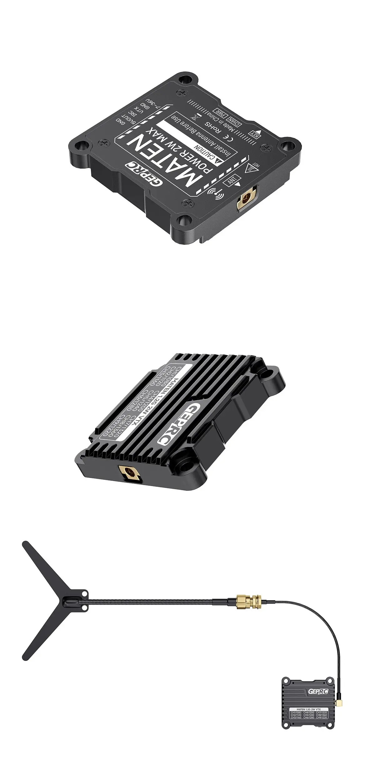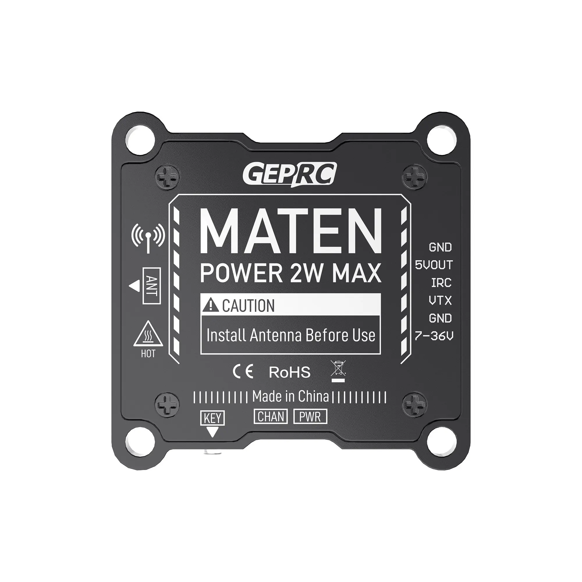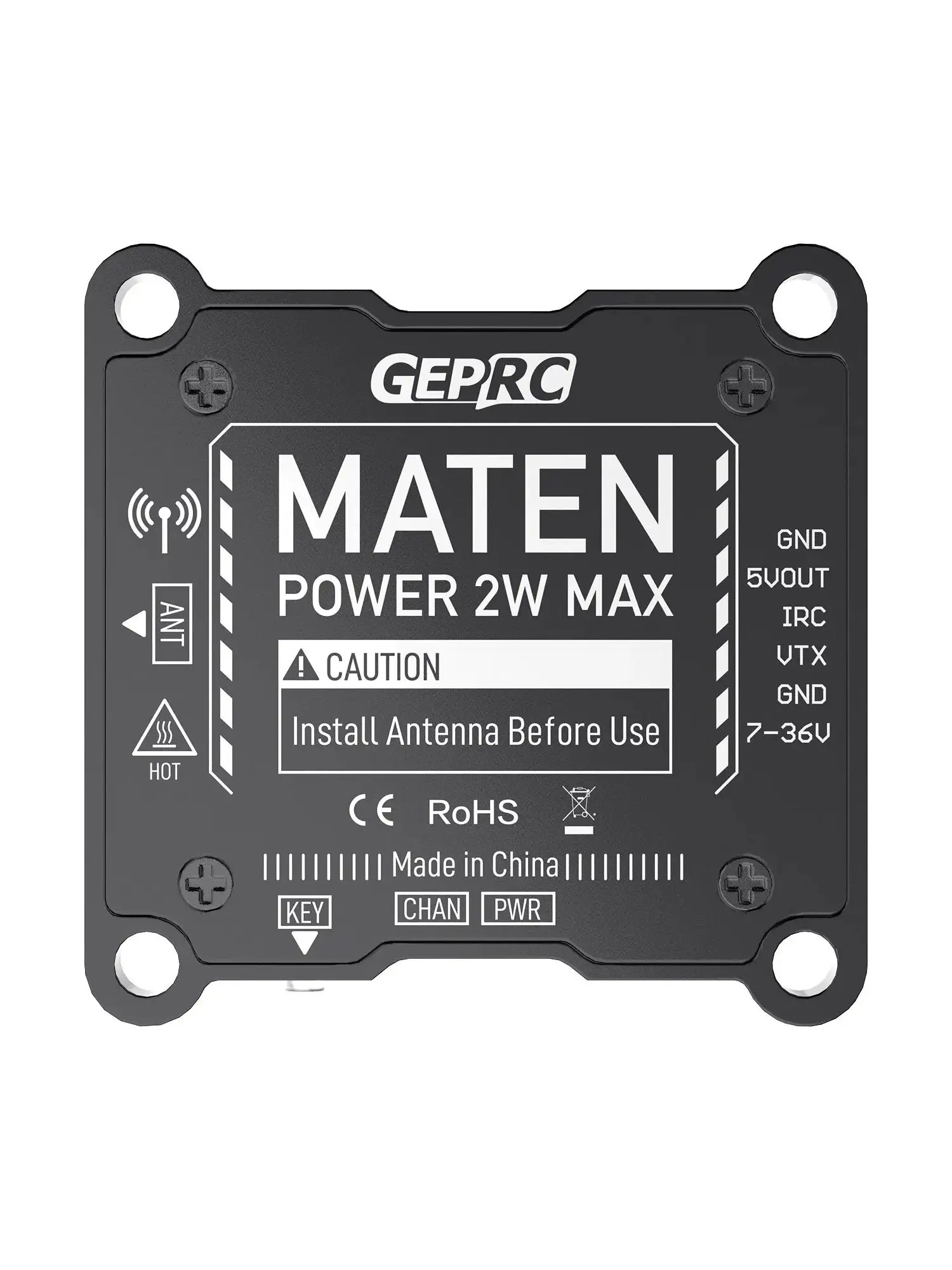 Новий потужний передавач MATEN 1.2G 2W VTX, розроблений командою GEPRC, тепер офіційно випущений. Його продуктивність дуже потужна, з 4 регульованими рівнями потужності і максимальною потужністю до 2000 мВт. Сигнал передачі дуже стабільний, а проникність відмінна.