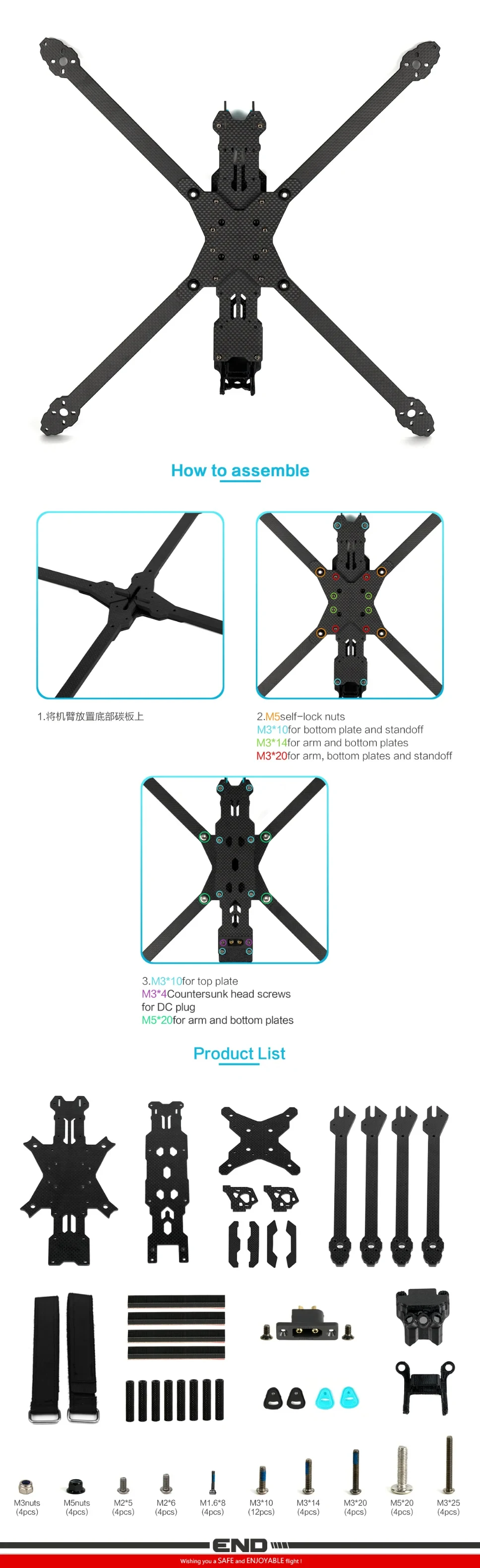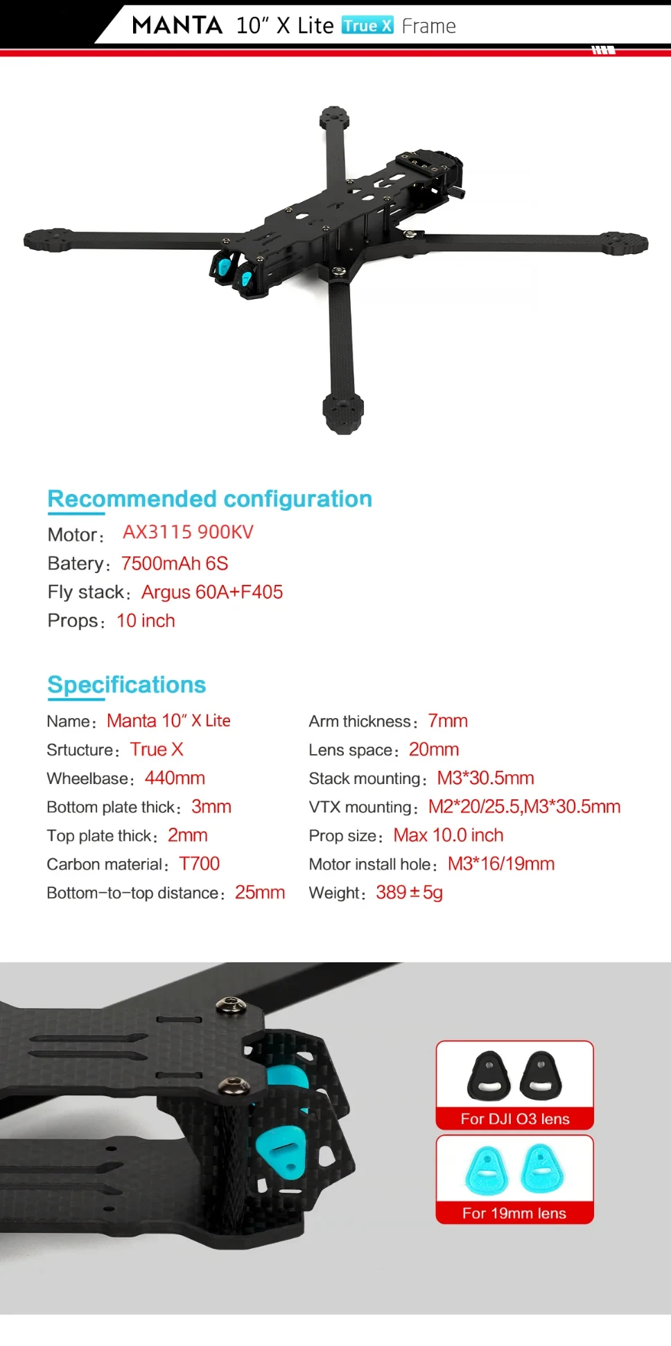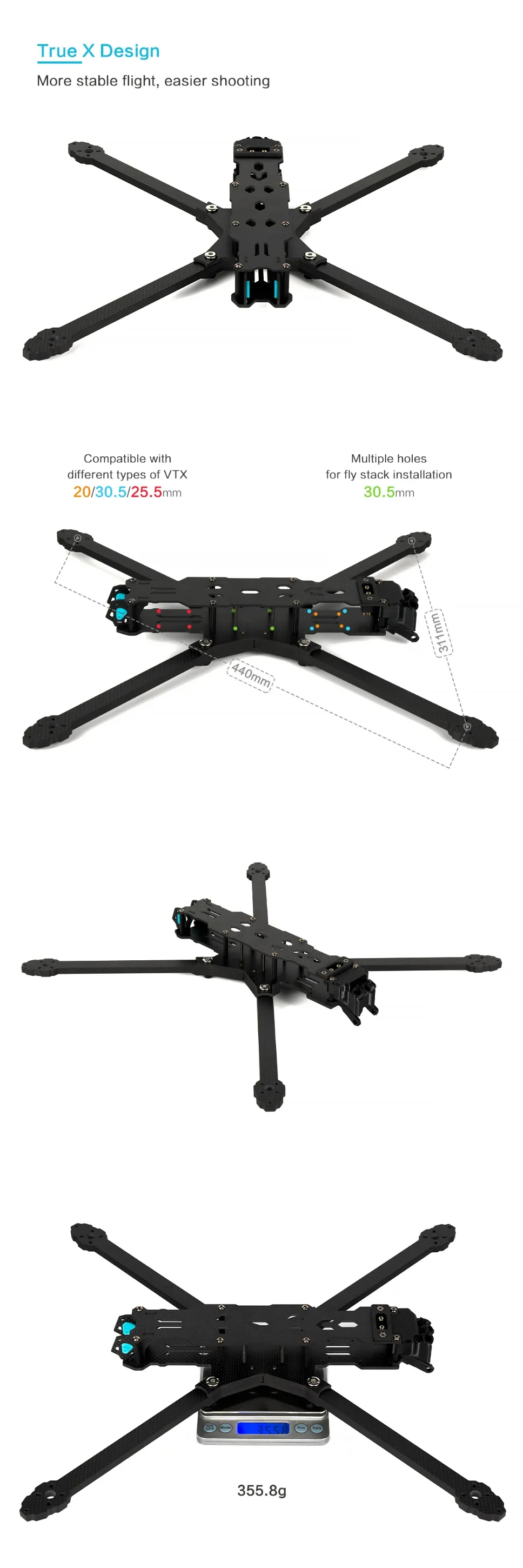 - Отвори для кріплення моторів: M3*16/19 мм, рекомендовані 3115 900kv та 10-дюймові пропелери