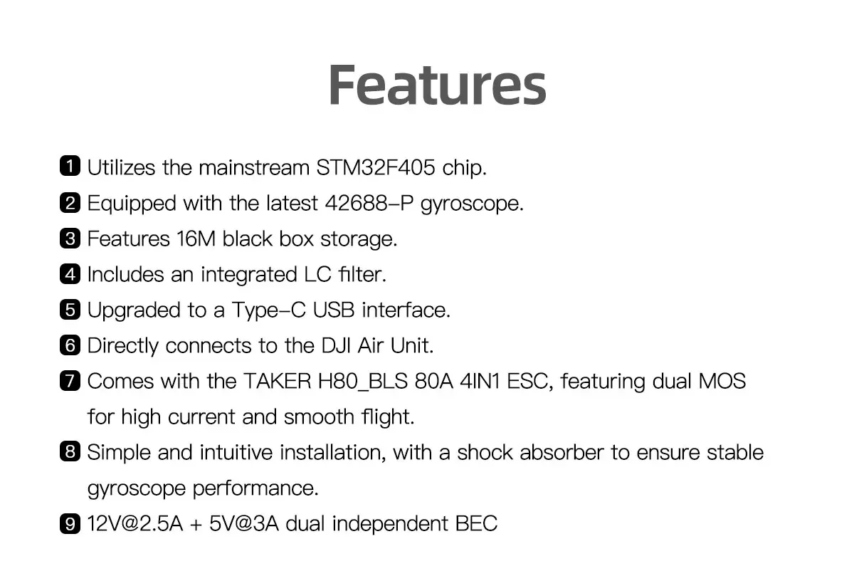 - BEC: 5V@3A, 12V@2.5A (подвійний BEC)
