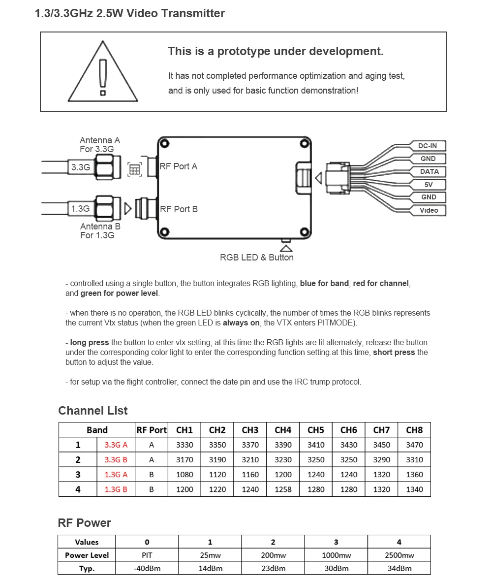 Відеопередавач RushFPV 1.3G/3.3G VTX Dual-Band підтримує частотні діапазони 1.3GHz та 3.3GHz, забезпечуючи стабільну передачу сигналу. Потужність передавання регулюється в межах 25mW, 200mW, 1000mW та 2500mW, що дозволяє адаптувати пристрій під різні умови експлуатації. Живлення подається від джерела напругою 7–30V, що забезпечує сумісність із більшістю систем. Керування здійснюється кнопкою, що робить налаштування простим і зручним. Пристрій обладнано SMA-конектором для антен довжиною 165 мм і 170 мм.