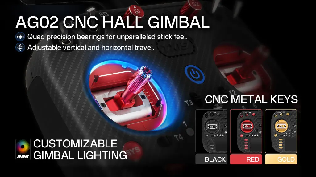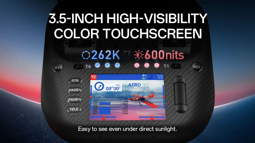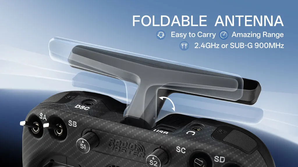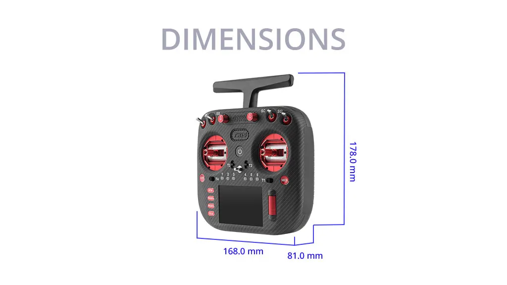 - для стабільної роботи. Інтелектуальна схема балансу батареї збільшує час польоту, а компактна, складна антена покращує портативність і гарантує якісний сигнал. Вбудований гіроскоп із функціями TiltX/TiltY відкриває нові можливості, дозволяючи вмикати тумблери, керувати панорамою/нахилом камери чи активувати телеметрію простим нахилом апаратури.