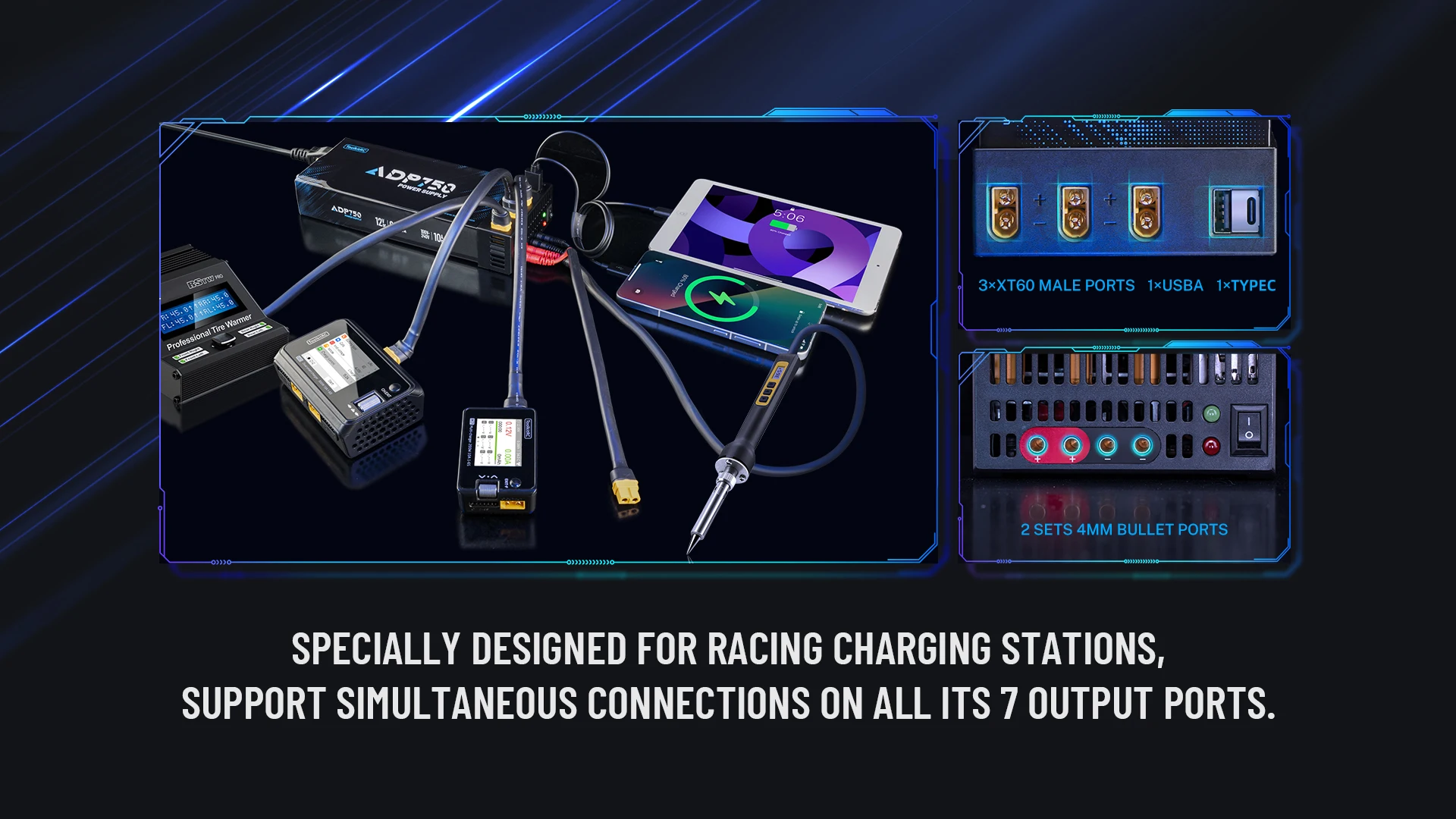 Потужний універсальний DC зарядний пристрій / блок живлення 12V, призначений для живлення та заряджання електроніки, акумуляторів і високострумових навантажень. Підтримує одночасну роботу з кількома типами виходів: XT60, 4mm bullet (банани), USB-C PD та USB-A QC, що робить його ідеальним інструментом для сервісних інженерів, електронників, RC-ентузіастів та DIY-проєктів.