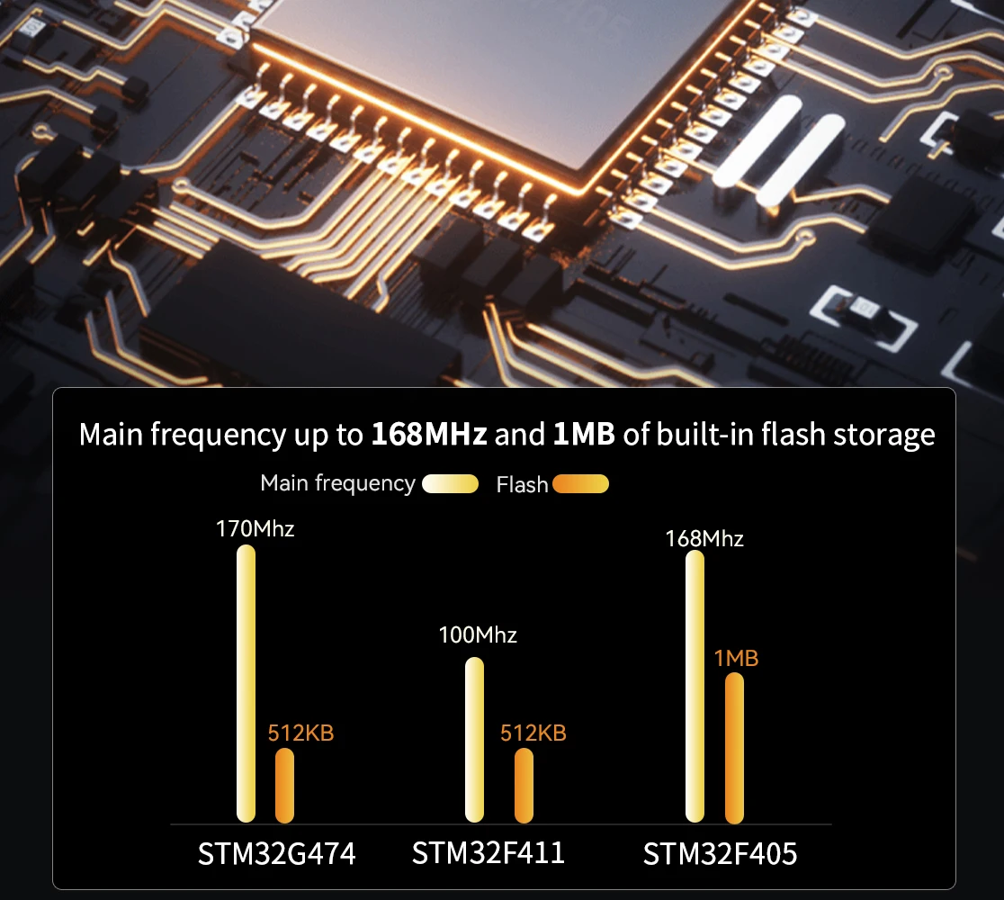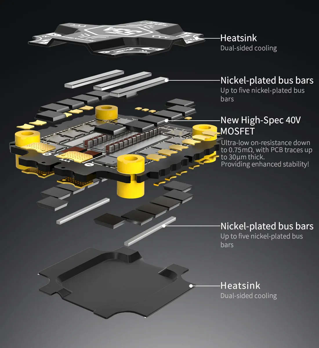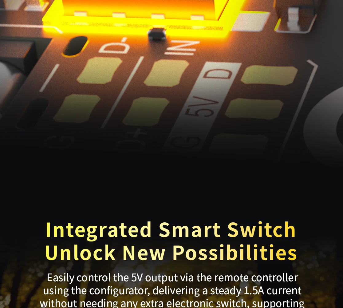 - Незалежний 5V BEC вихід: 9 груп (4× +5V спереду, 1× BZ+ для бузера, 4× +5V на кутах для LED). Загальний струм: 1.5A.