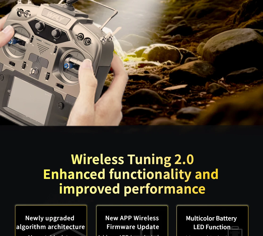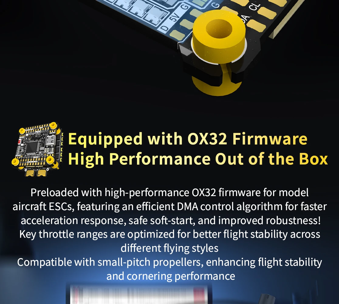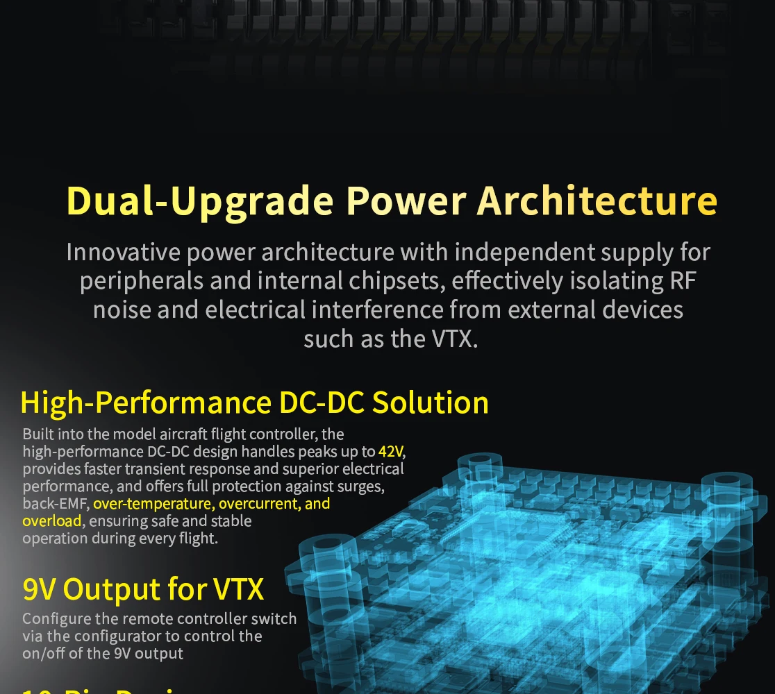 - Незалежний 9V BEC вихід: 2 групи (1× 9V спереду, 1× у задньому конекторі). Загальний струм: 3A. Підтримка PINIO для віддаленого вмикання/вимикання.